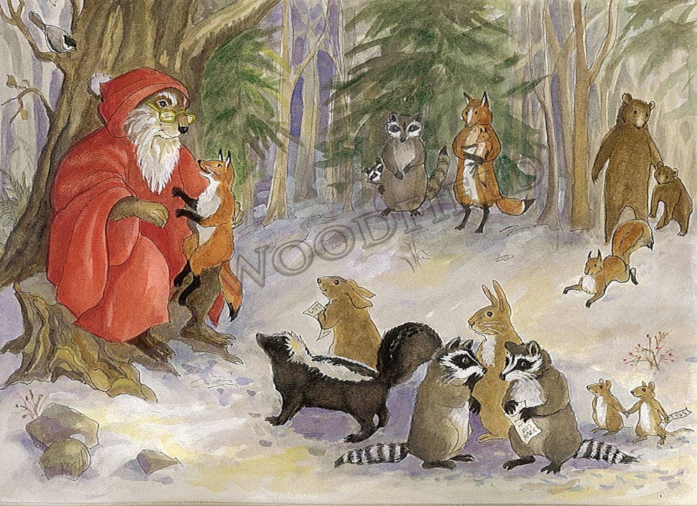 This boxed set includes twelve sturdy 4-1/8" x 5-1/2" cards, all featuring the same charming image without a border, perfect for standing display. Each set comes with 12 bright red envelopes and is neatly packed in a clear box. On the back, enjoy a whimsical story: once a year, all the young creatures of the woods and meadows gather in the clearing to receive a special gift from Old Grandfather from Far-Away.