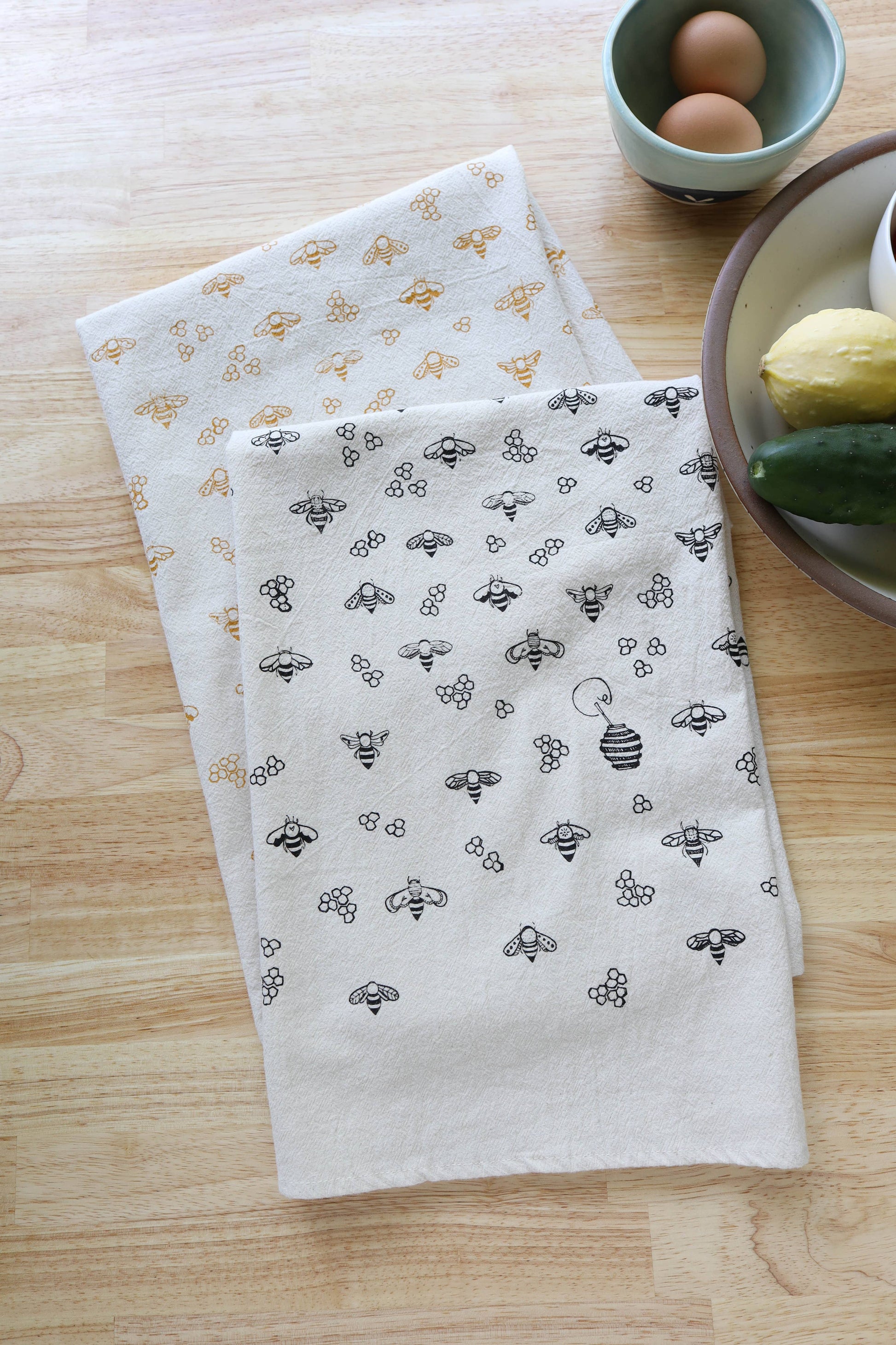 This handprinted kitchen towel, featuring our hand drawn bee design, is made from natural, unbleached, recycled Turkish cotton and printed by hand in our Asheville, North Carolina studio. Measuring 27" x 27", it is soft, absorbent, durable, and designed for daily use—improving with every wash. Available in Gold or Black.