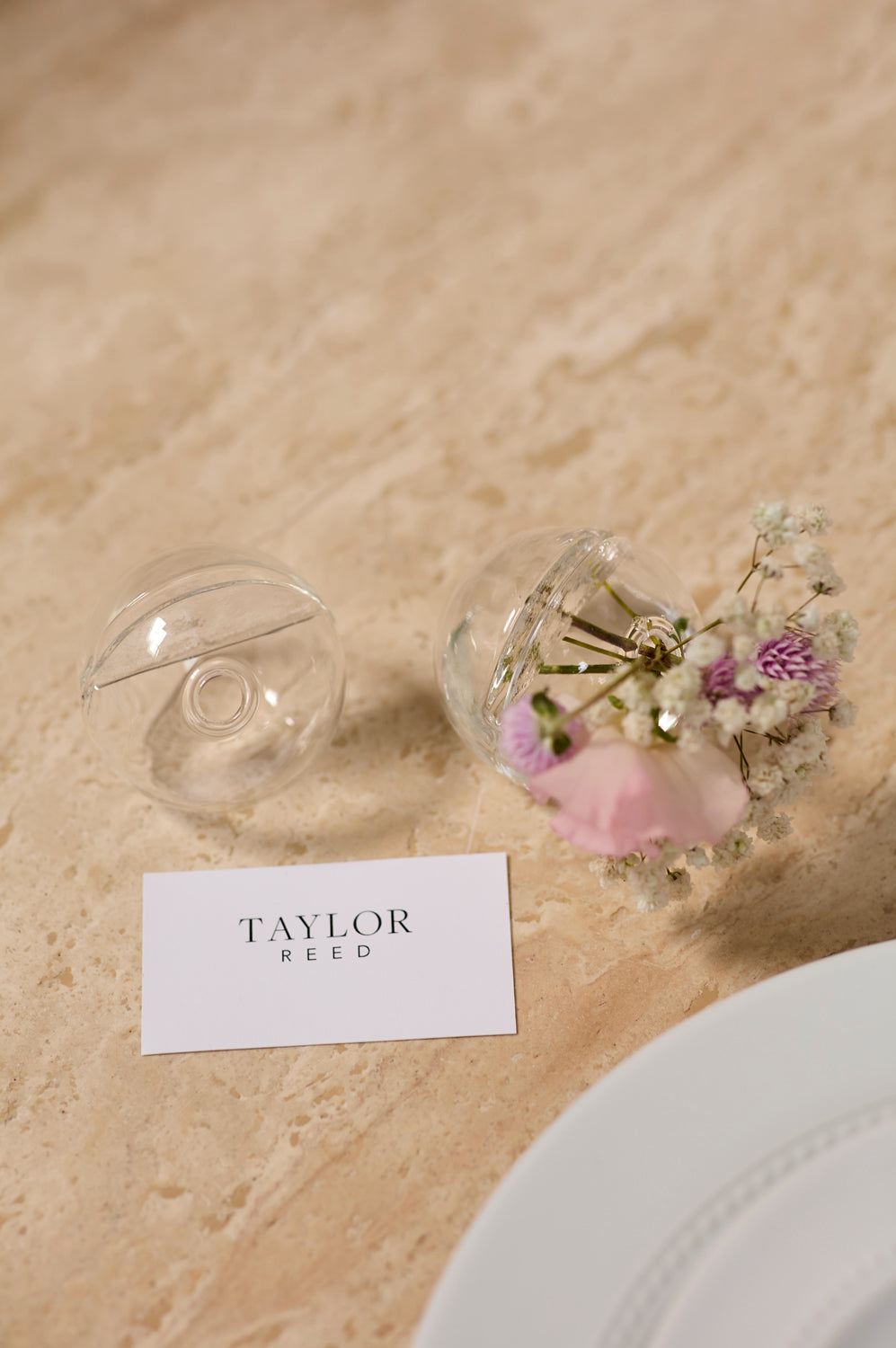 Make a special table setting for wedding & event guests with the petite, elegant clear borosilicate glass Blossom Budvase. With a round body & flat base, this vase can hold a name card in the center slit & 1 or 2 stems in the small rounded opening.