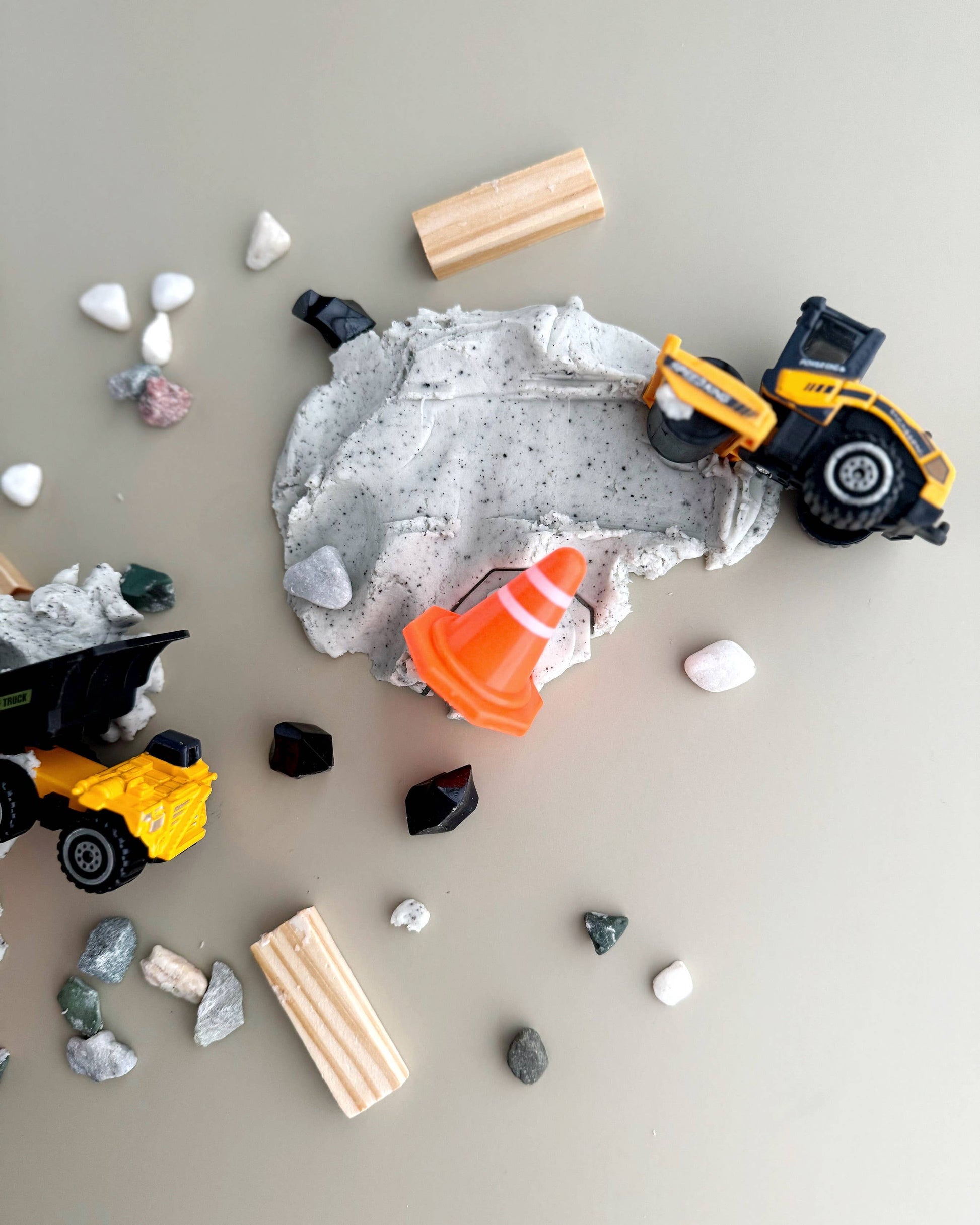 Includes: 8 oz Gravel Grey (Cookies & Cream) KidDough, Construction Vehicle, Construction Cone, Road Signs, Mini Lumber Pieces, Black Acrylic Rocks and Natural Stones.