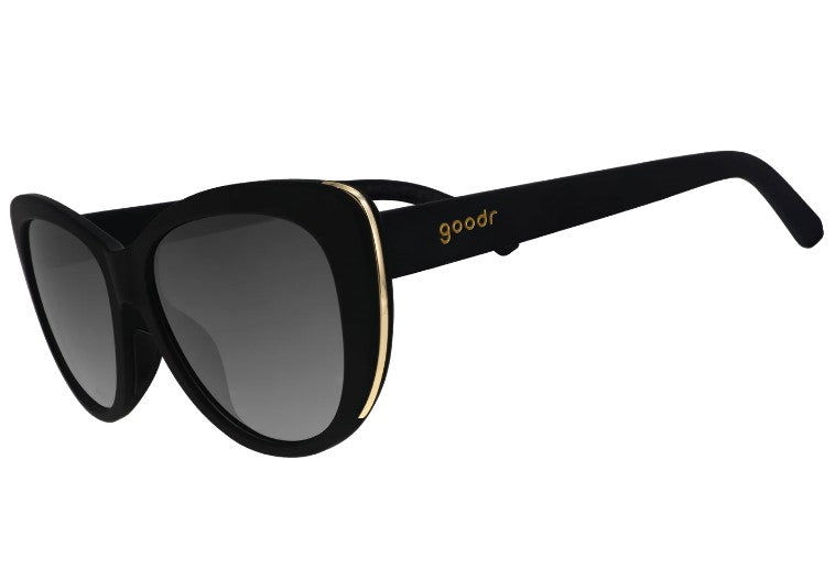 These black cat-eye sunglasses with black non-reflective lenses & light gold accents are giving fashion icon. Won't slip or bounce when vogueing down the catwalk or the sidewalk.