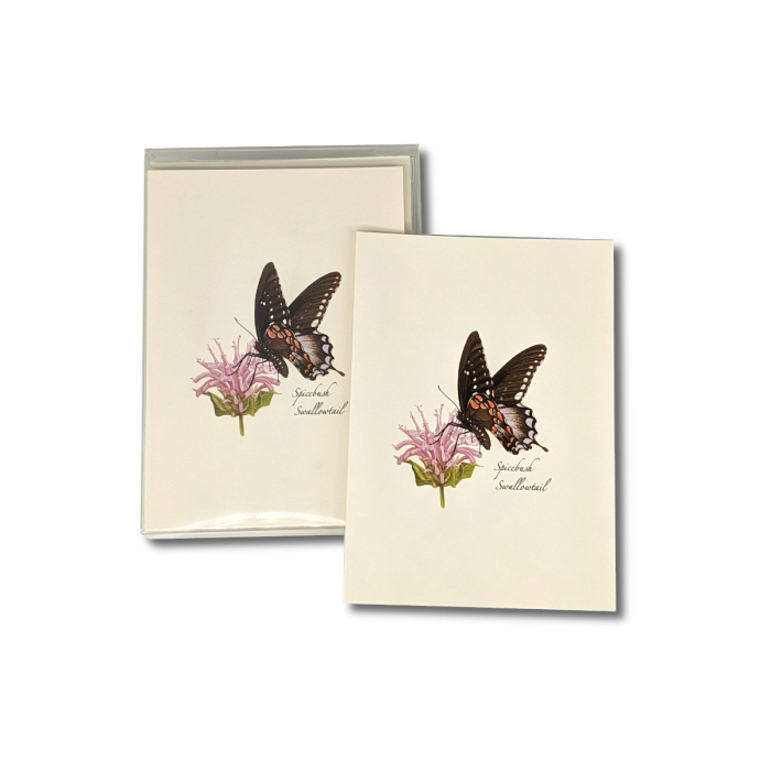 Graceful and captivating, these Spicebush Swallowtail Notecards flutter with the deep blues and velvety blacks that make this native butterfly so enchanting. Illustrated by Emily Damstra and reproduced with exceptional quality, each design captures the delicate beauty and quiet resilience of this pollinator’s fleeting dance among wildflowers.
