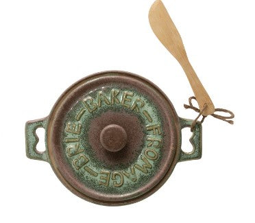 Serve up warm, melty brie in style with this charming stoneware baker. The reactive glaze creates a beautiful brown and tan finish that's as inviting as the cheese inside. Measuring 9-1/4" round with a 3-3/4" height, it's the perfect size for entertaining. Includes a bamboo spreader for easy serving—because the best cheese moments deserve the right tools.